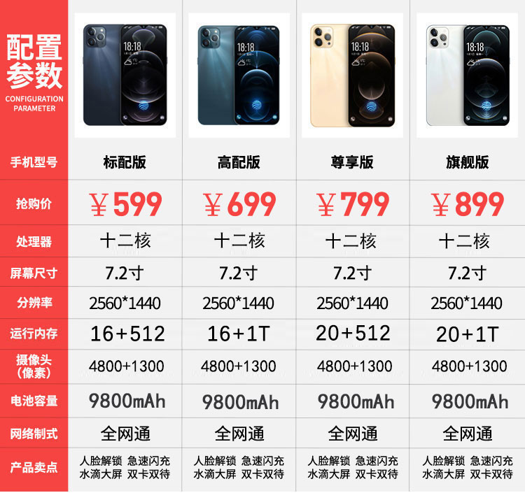 2026款上市新款(高端高端手机)五周年活动大促销,订购即送手机壳+钢化膜大礼包,品牌保证,15天包退,30天包换。京东包邮,货到满意才付款!最新产品,7.2寸美人穿孔屏+纳米渐变色机身+3D专业电竞放生芯片+红外夜视人脸识别+指纹解锁+应用分身+护眼模式+7800毫安超大续航电池+快充+电竞十核处理器+A18美颜摄影。限时特惠,数量有限,先到先得! 1T大内存,原价7999元秒杀价699元